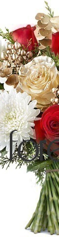Celebrate the season in style with the Angels On High Christmas Flower Arrangement. A striking display of fresh seasonal blooms, it includes 6 ruby red roses, 4 Champagne roses, 2 white chrysanthemums, and a selection of seasonal leaves and foliage that have been given the Midas Touch. Designed to make a luxurious addition to reception desks, desktops, dinner tables, and festive celebrations, it is an exceptional flower gift for the season of goodwill.