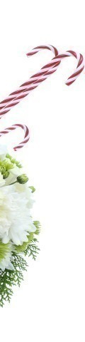 5 White Roses, 2 White Gerbera, 5 White Carnations, Green Chrysanthemums, 5 Candy Canes, 3 Red Candles