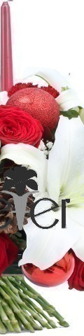 4 White Lilies, 6 Red Roses, Gypsophilia, 4 Red Baubles, 2 Pine Cones, 1 Red Candle