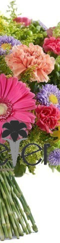 2 x Yellow Football Chrysanthemums, 2 Hot Pink Gerbera, 2 Orange Carnations, 6 x Spray Carnations, Purple Matsumoto Asters, Green Hypericum Berries
